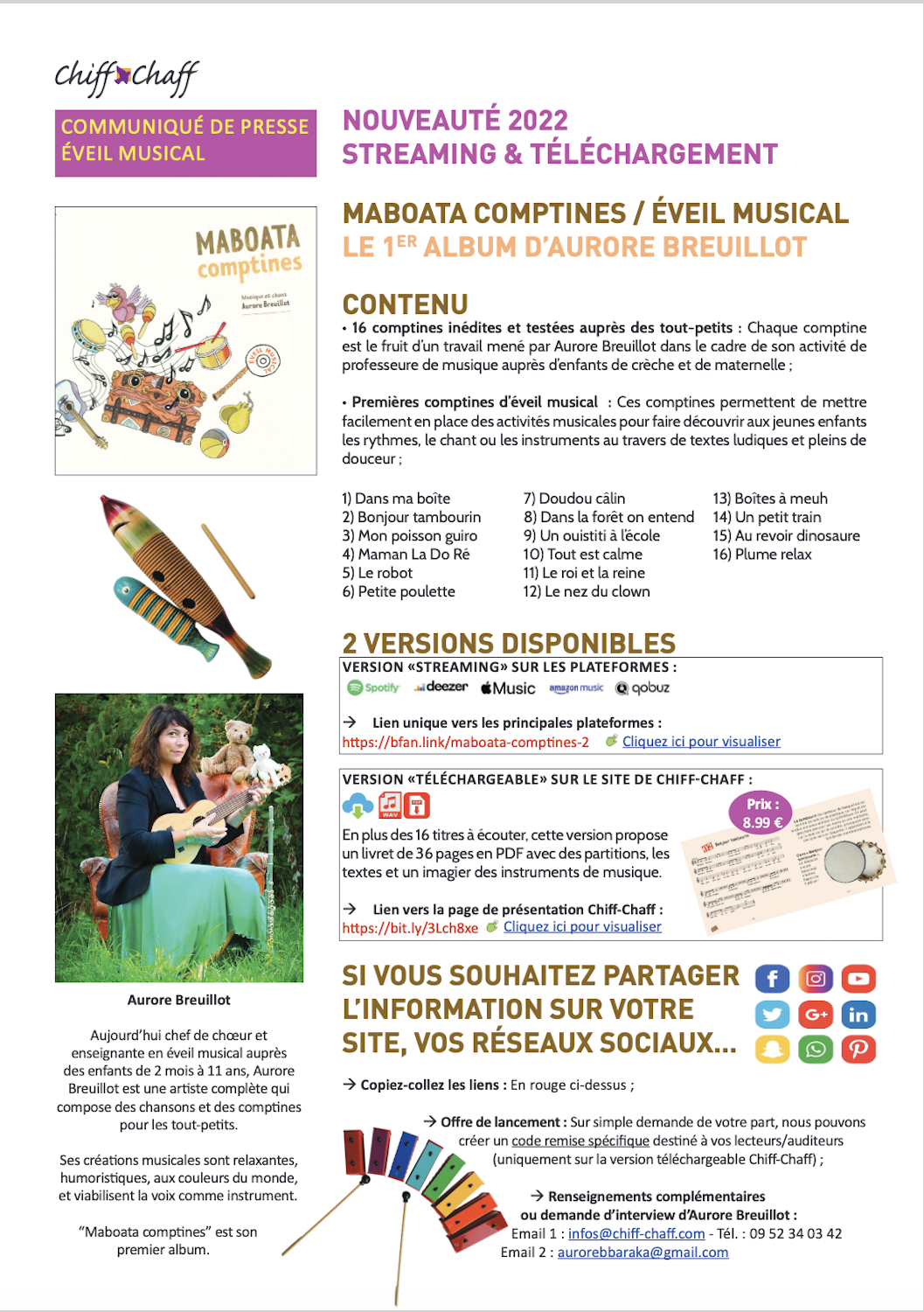 Aurore Breuillot vient de produire son premier album de comptines inédites pour les tout-petits "Maboata". Vous trouverez toutes les informations sur la page de présentation ci-dessous.